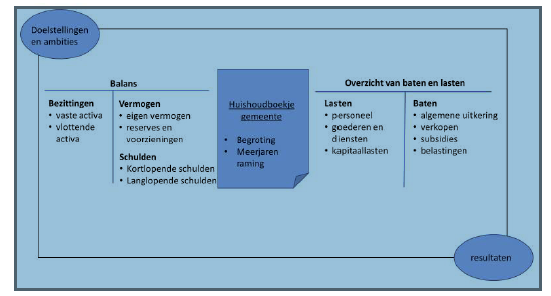In de afbeelding hieronder staat op hoofdlijnen het huishoudboekje van de gemeente. De kern bestaat uit de begroting en meerjarenraming, met aan de ene kant de balans (vermogen) en de andere kant de baten en lasten (exploitatie).